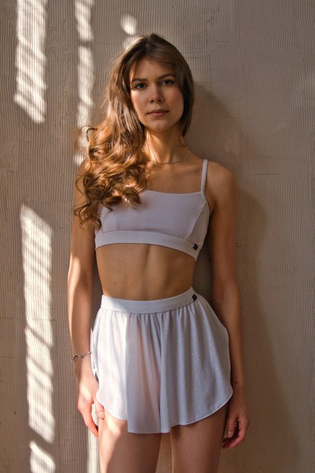 Spódnico-spodenki Rose w tańcu pole dance nadają lekkości i zwiewności. Wykonane są z cienkiego, lejącego materiału o połyskującym wykończeniu. Delikatne marszczenie w pasie oraz elastyczna gumka w pasku sprawiają, że spódniczka idealnie dopasowuje się do sylwetki. Dzięki temu, że spódniczka jest zszyta w kroku (dlatego są to spódnico-spodenki) nie podwija się i nie przesuwa nawet podczas odwróconych, czy dynamicznych figur. Pod spodem wszyte są dodatkowo spodenki z elastycznej lycry – przylegające, ale wygodne, gwarantujące swobodę ruchów. Dzięki temu spódniczka Rose zawsze pozostaje na swoim miejscu.